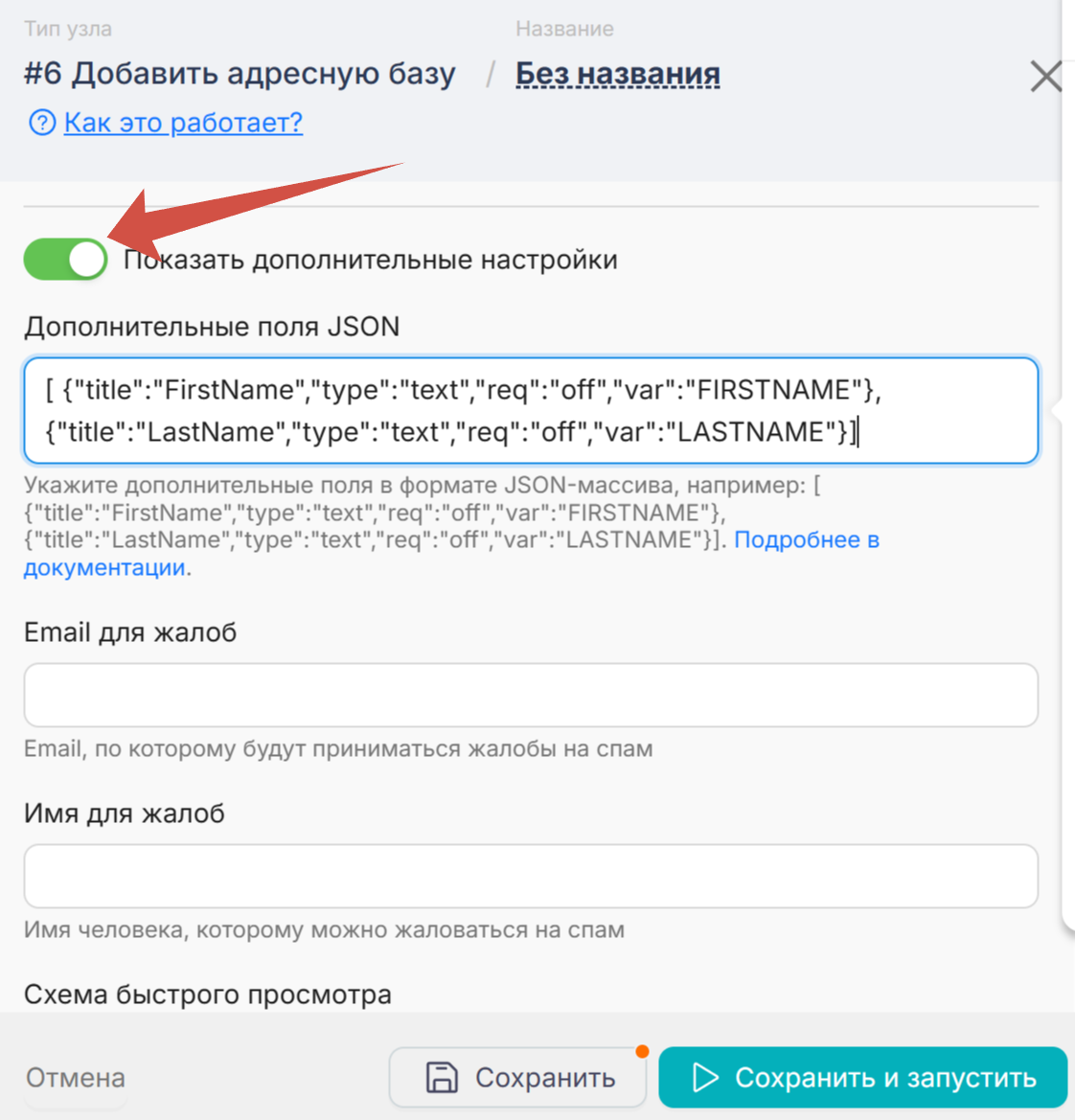 Далее введите необходимые вам дополнительные поля следующим образом в поле “Дополнительные поля JSON”
