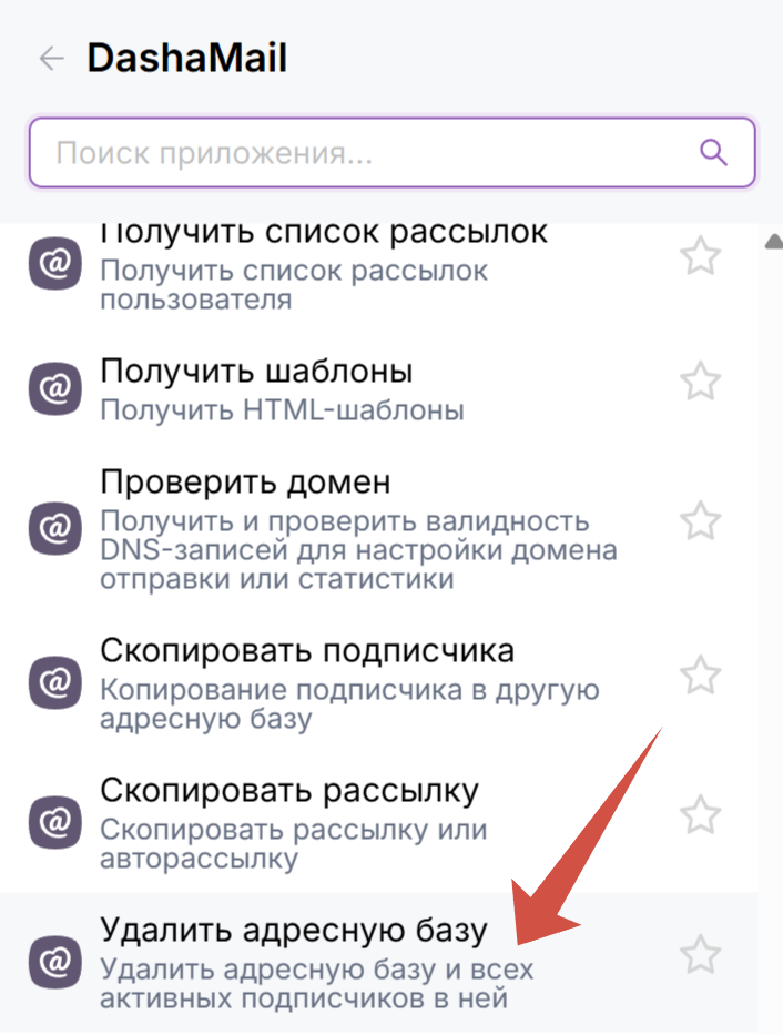 Найдите среди функций DashaMail “Удалить адресную базу”