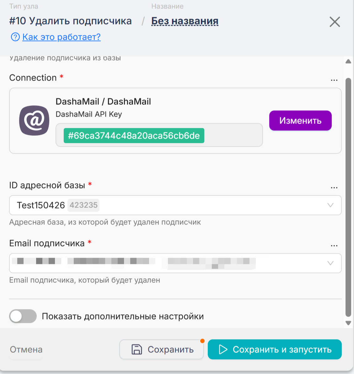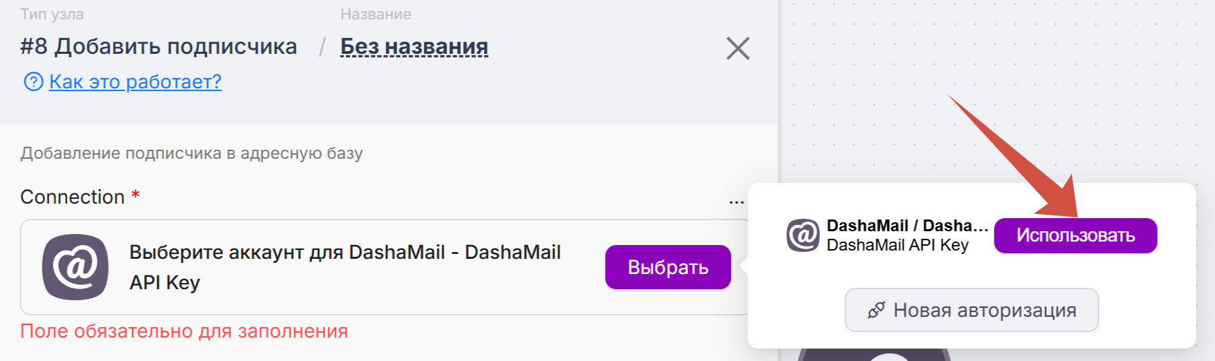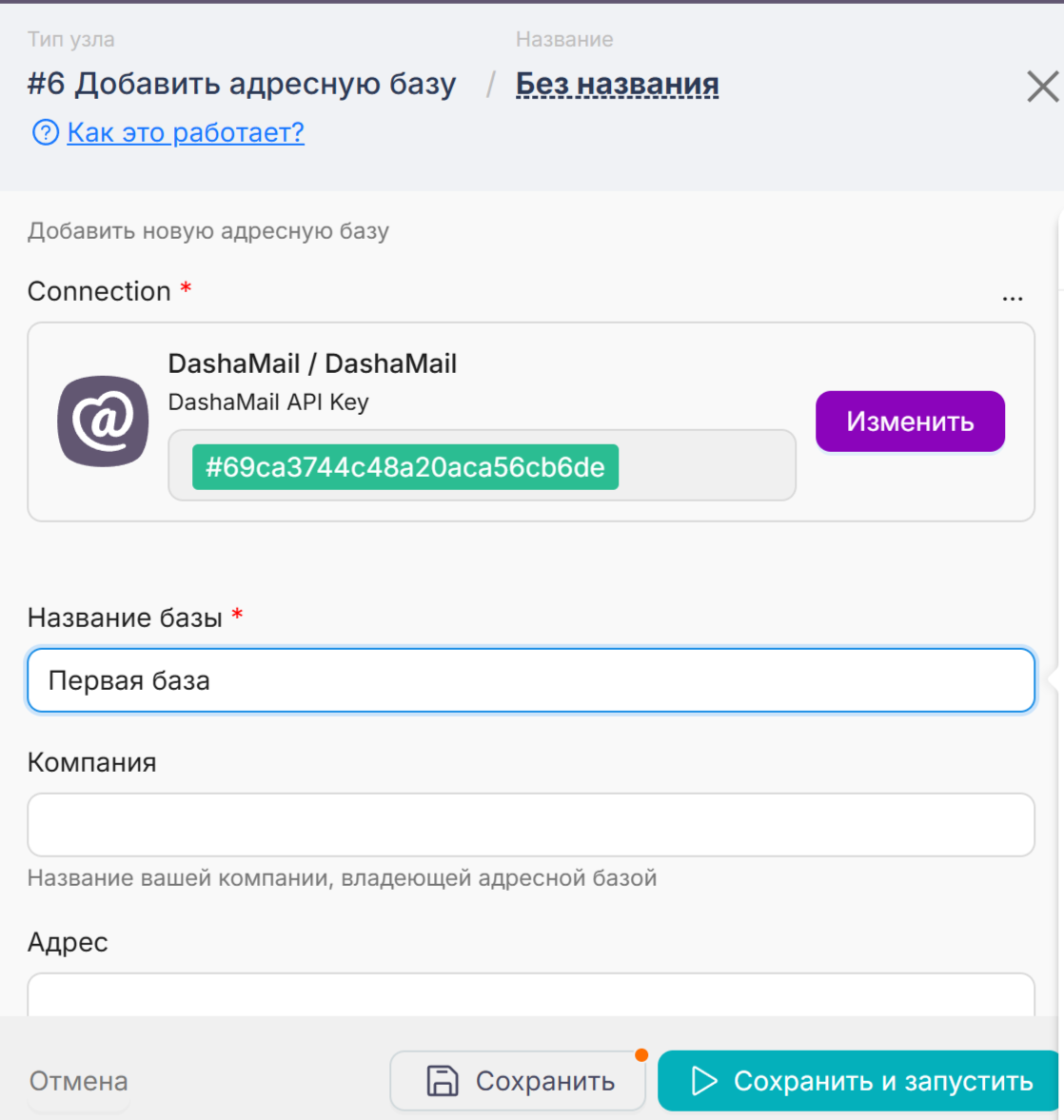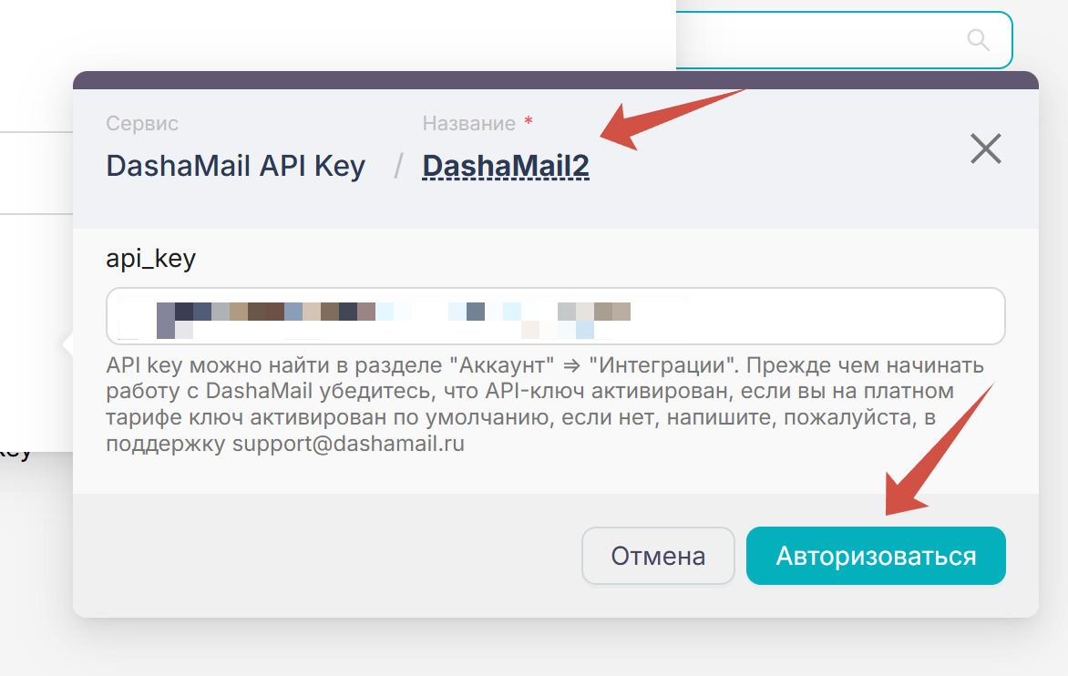 Введите API-ключ от DashaMail. Его можно найти в личном кабинете в разделе “Интеграции”. Если вы на бесплатном тарифе, попросите, пожалуйста, нашу поддержку support@dashamail.ru активировать вам API.
