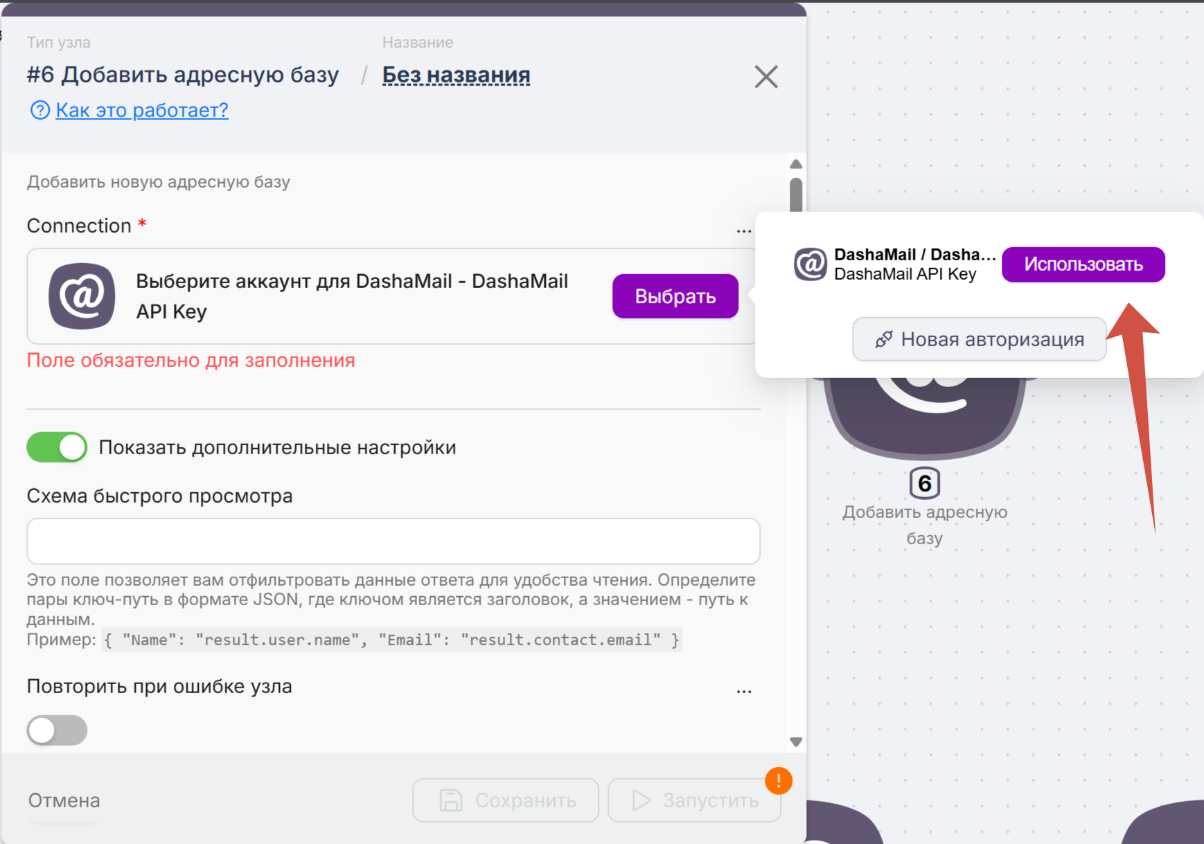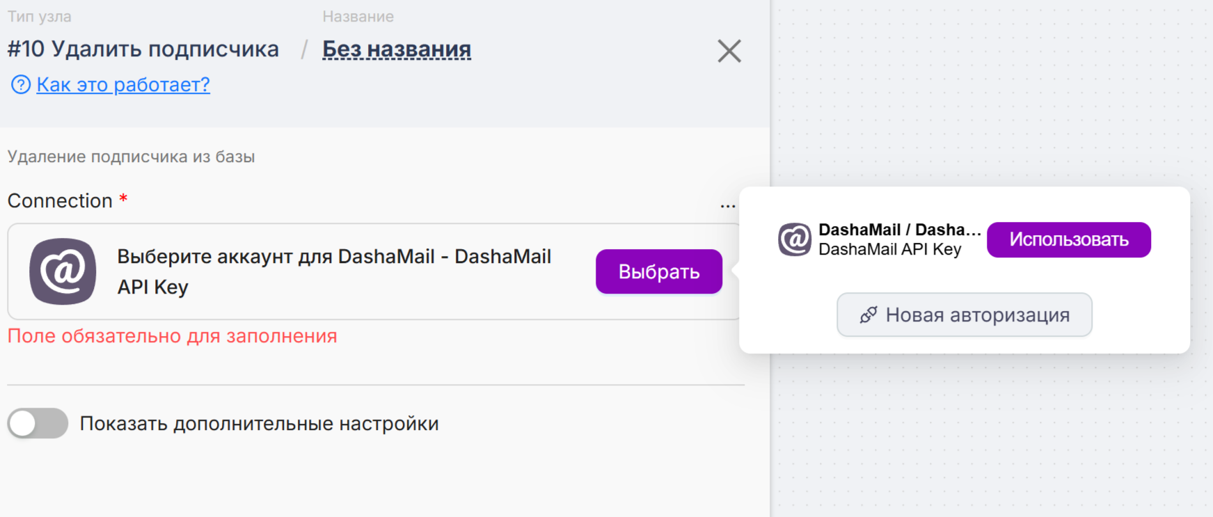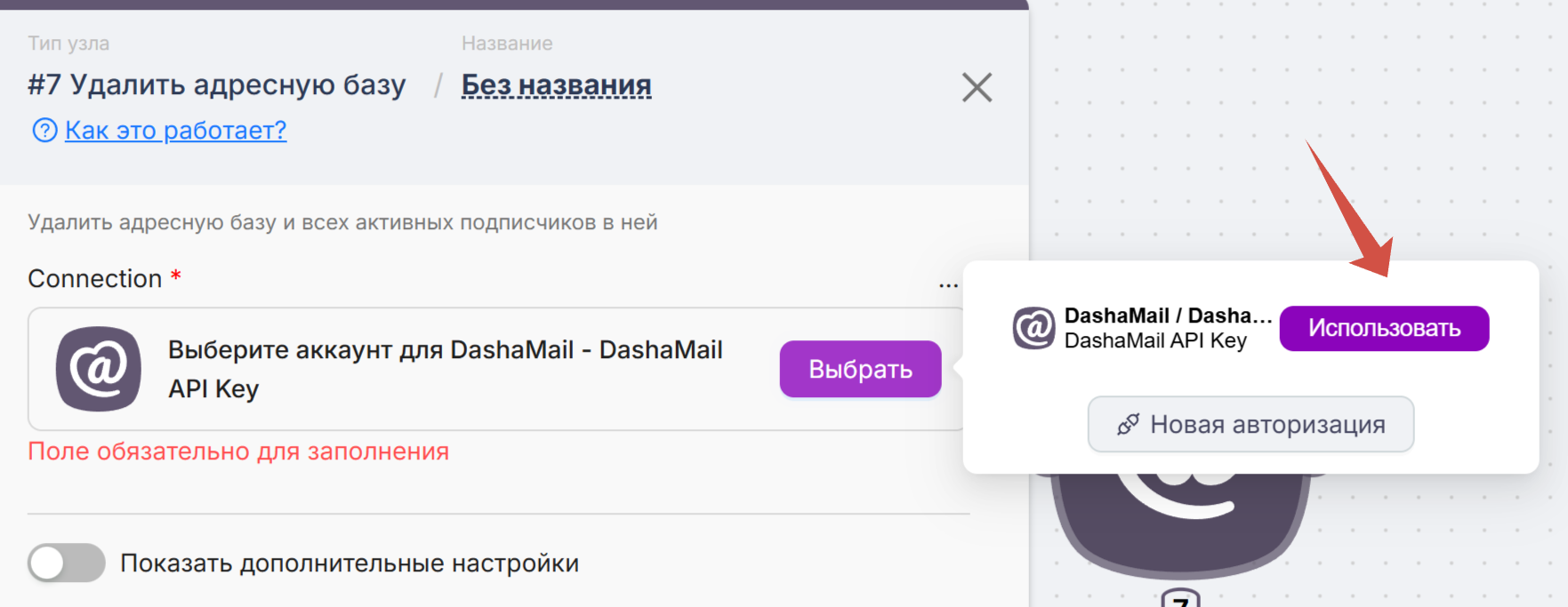 Введите API-ключ от DashaMail. Его можно найти в личном кабинете в разделе “Интеграции”. Если вы на бесплатном тарифе, попросите, пожалуйста, нашу поддержку support@dashamail.ru активировать вам API.