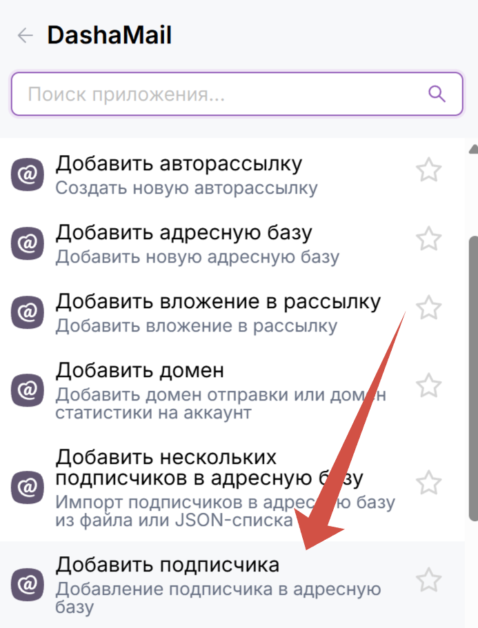 Найдите среди функций DashaMail “Добавить подписчика”