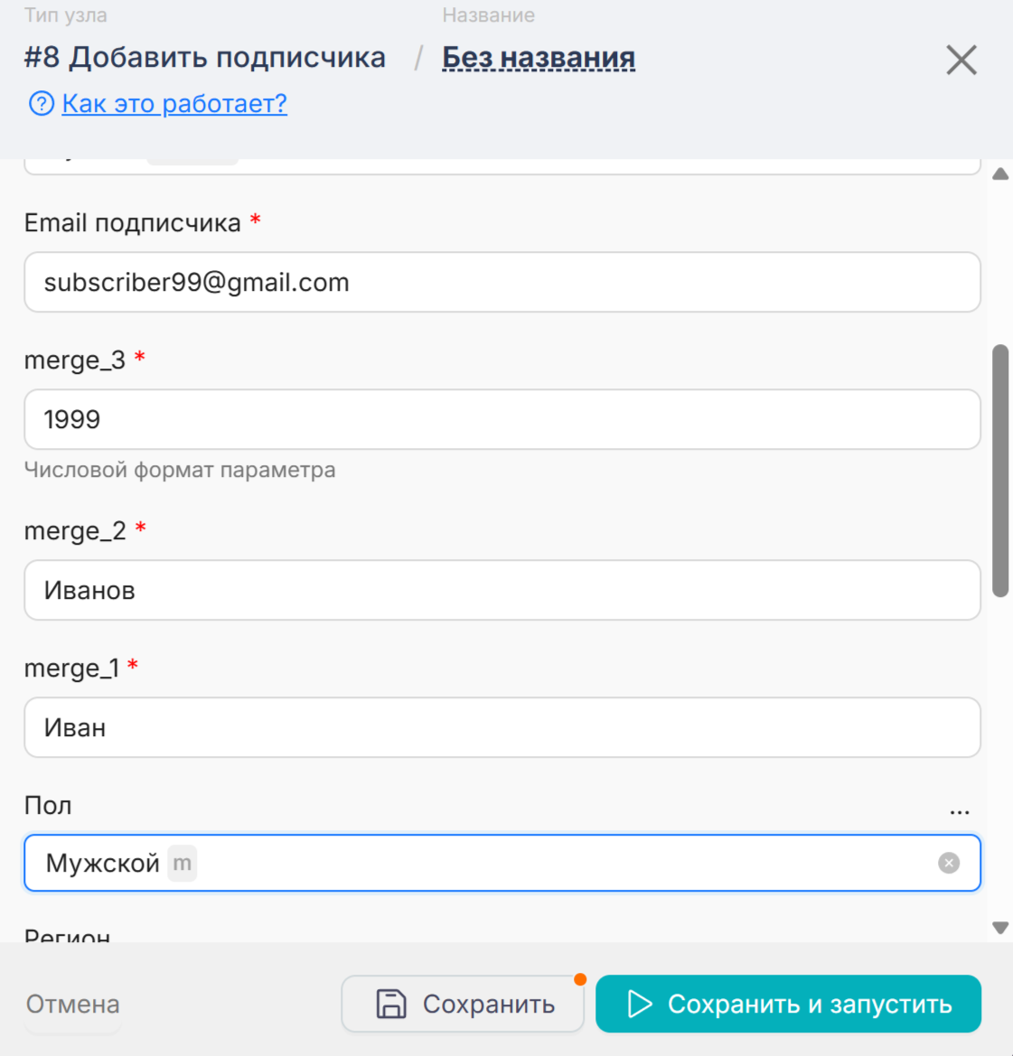 Заполните все необходимые поля, в поля должны быть переданы переменные, в которых содержатся данные из другой платформы, например. На скриншоте приведен пример, как это могло бы выглядеть