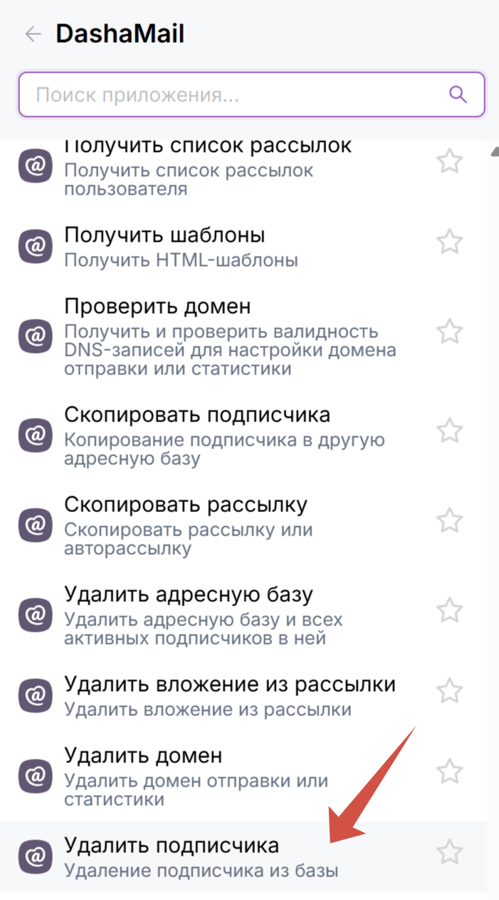 Найдите среди функций DashaMail “Удалить подписчика"
