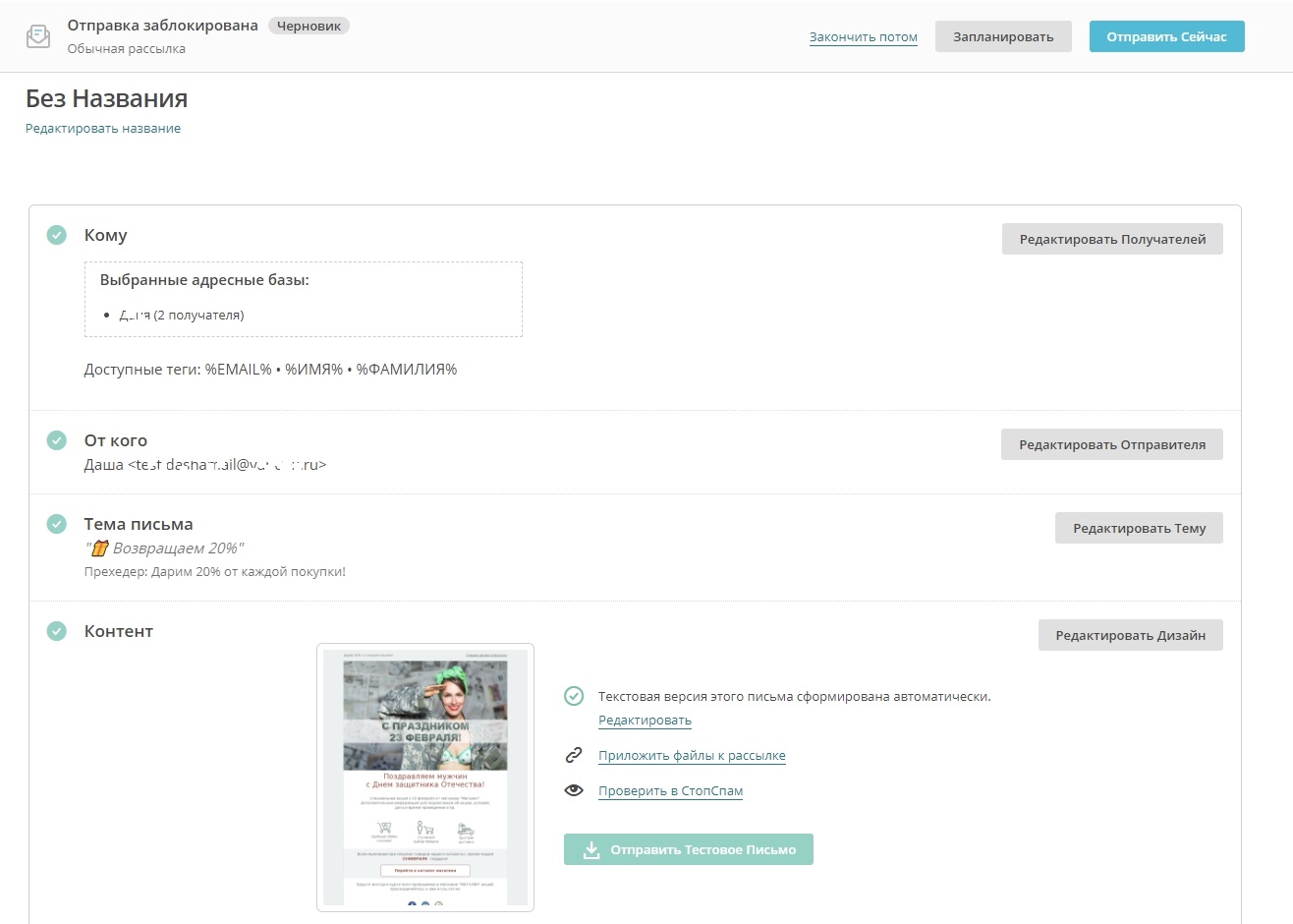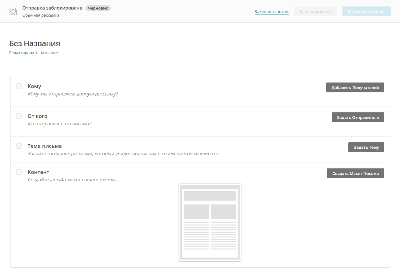 Все корректно заполненные пункты создания рассылки выглядят так: