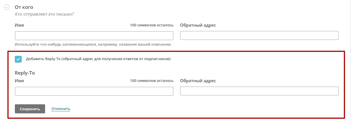 Здесь же можно задать адрес Reply-To для получения ответов от подписчиков в тех случаях, если Вы не хотите использовать текущий обратный адрес в качестве получателя ответов:
