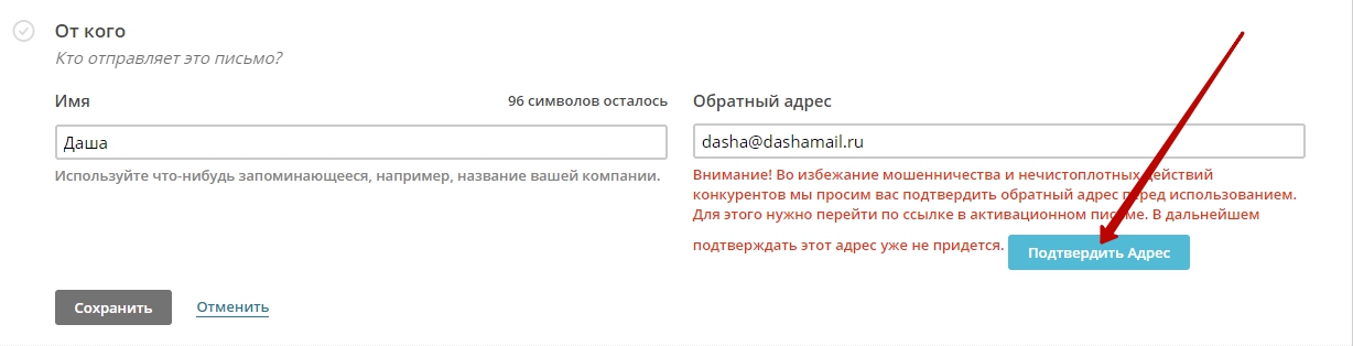 Email компании, на который, в случае необходимости, подписчик может отправить ответное письмо. Он НЕ может быть произвольным, Вам придется его подтвердить и, тем самым доказать, что у Вас к нему есть легальный доступ. Это вынужденная мера, чтобы пресечь действия мошенников, использующих чужие адреса для своих рассылок. Нажмите на кнопку "подтвердить адрес", и на указанный email будет отправлено письмо.