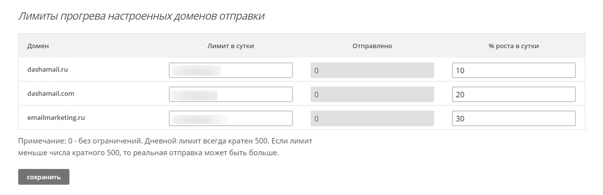 Здесь же вы можете задать лимиты на прогрев новых доменов отправки:
