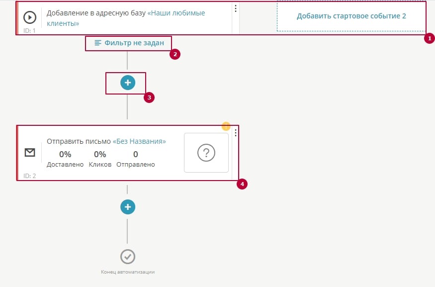 Автоматизация - это цепочка или группа цепочек писем, которые визуализируются в формате mindmap (интеллектуальной карты).