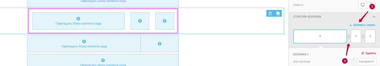 Отключить отображение строки на мобильном устройстве или ПК вы можете в свойстве Скрыть. В параметре Структура колонок можно добавить колонку в строку (1), а также изменить ширину колонки, поместив курсор мыши между колонками, которые нужно изменить (2). Высота колонки регулируется автоматически в зависимости от контента: