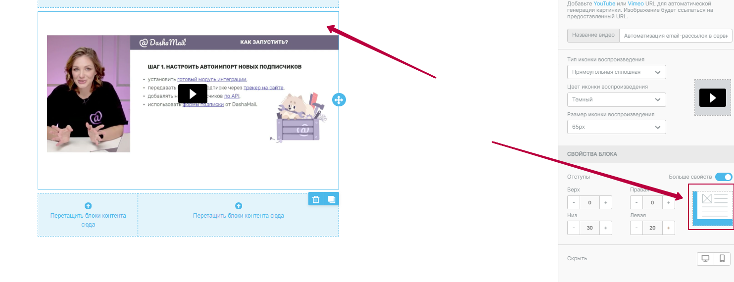 Чтобы добавить видео на лендинг, перетяните блок Видео в нужную строку: