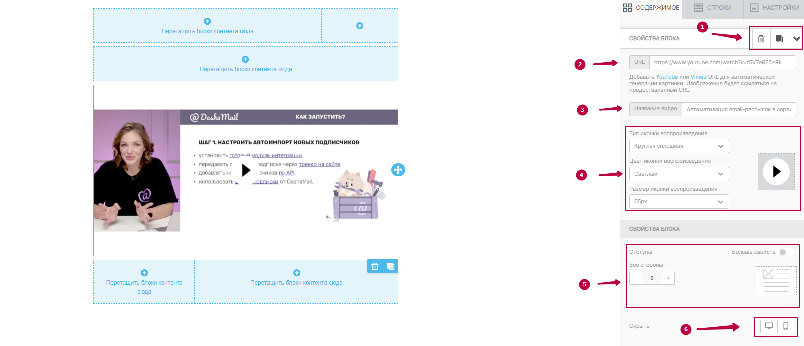 1. Задает свойства блока, в нем размещены кнопки для удаления, дублирования и перехода в меню к другим блокам.