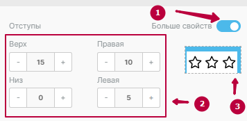 Параметр Отступы задает отступы внутри блока. При включении слайдера (1) вы можете настроить отступы для каждой стороны отдельно (2). Изображение (3) поможет визуализировать заданные отступы: