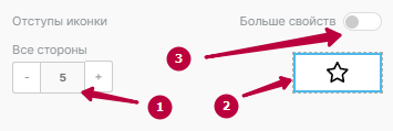 Настройка Отступы иконки позволяет задать отступы для иконок (1). Изображение рядом (2) помогает представить заданные отступы. Переключив слайдер (3), вы можете задать отступ для каждой стороны иконки отдельно: